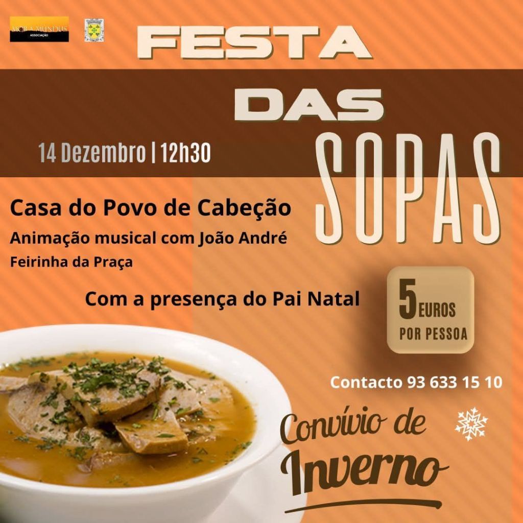 A 2ª edição da Festa das Sopas está quase aí. Será a 14 de Dezembro na Casa do Povo de Cabeção. Aparece e por 5 euros podes provar de todas as sopas em cima da mesa. O ano passado foram 12 sopas diferentes. Este ano logo se verá.